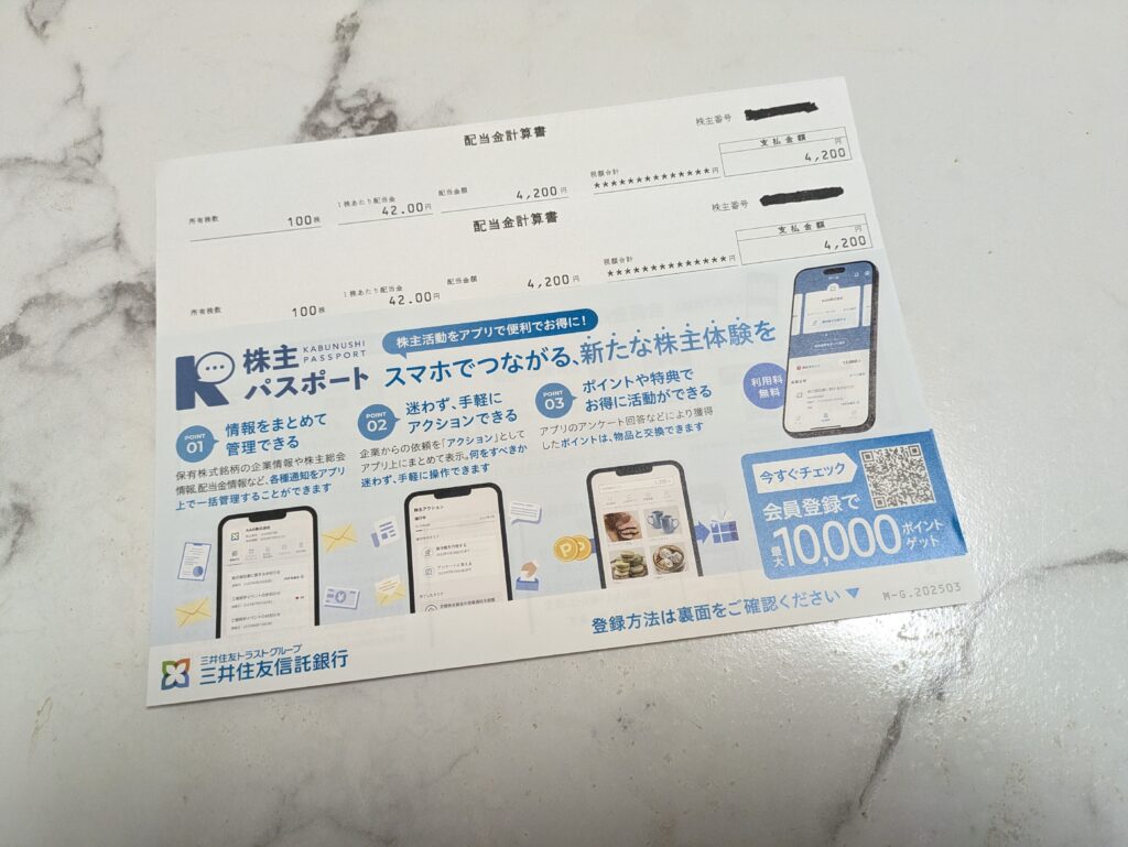 息子のジュニアNISA口座と私のNISA口座と、それぞれ100株ずつ2名義分。それぞれ4,200円の配当金ゲットです。