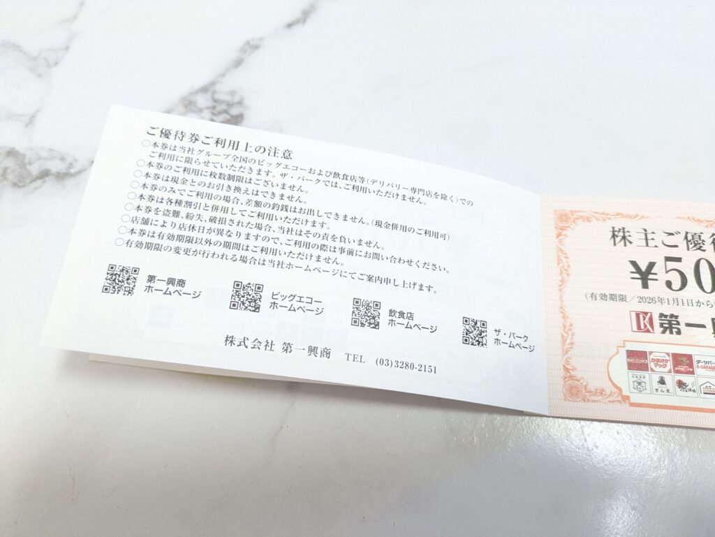第一興商はカラオケの「BIG ECHO(ビッグエコー)」や「ウメ子の家」などの飲食店を運営している企業です。息子と時々カラオケに行くのでビッグエコーの優待券目当てで買ってみました。