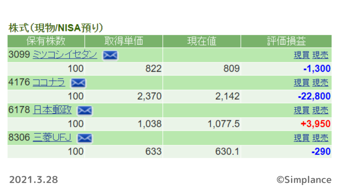 3月23日、24日と日経平均が下落した日に3月末の権利確定日に欲しい高配当株と優待が欲しい銘柄を買いました。(ココナラは上場日に買ったので19日です。)