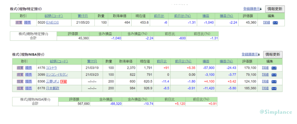 エネオスは特定口座で買いました。NISA枠は残り56万円ほどしかないのと、これはもし上がったらいったん売りたいなーと思いまして…まぁ早速含んでいるのですが笑。