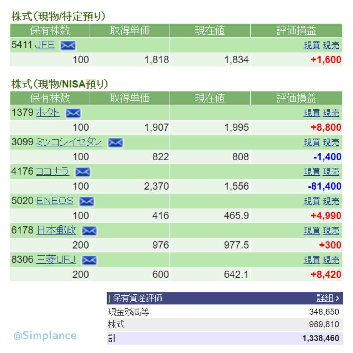 考えてみると、ココナラ以外は配当目当ての長期保有なので含み益でも含み損でもあまり関係ないんですよね。余程上がらない限り売るつもりもないので。精神的には含み益になっている方が嬉しくはありますが。