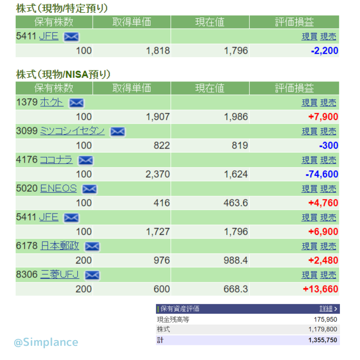 先週、特定口座で買ったJFEは含み損になっていますが、NISA枠で買った分で総合的にはプラスに。「持ってて良かったUFJ」様も上げ上げだったので、含み損はだいぶ減りました。(これでもまだまだ含み損なココナラ株の威力…)