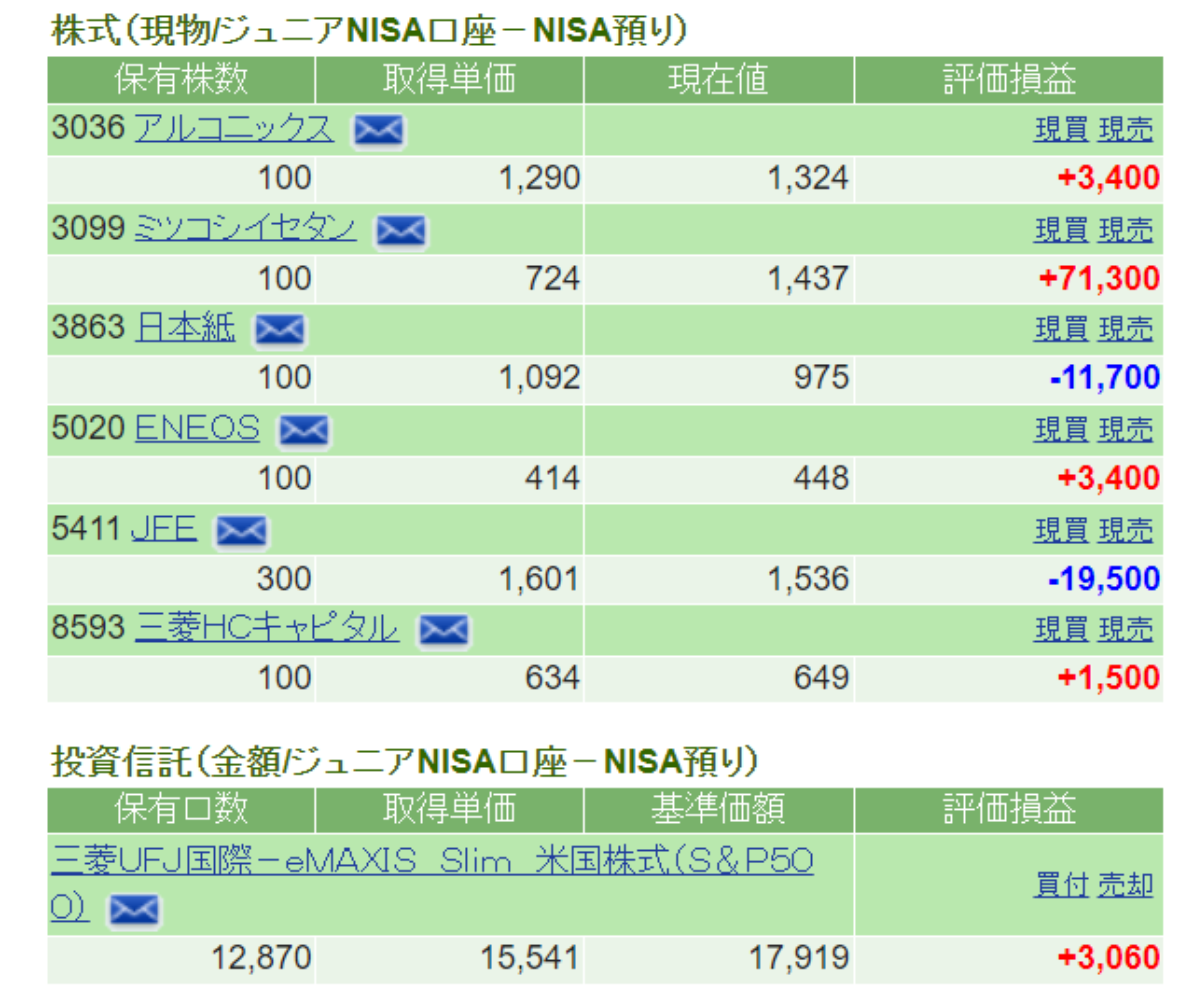 去年はほぼトントンだったジュニアNISA口座ですが、今年は配当金・含み益を合わせると10万円くらいプラスになりました。