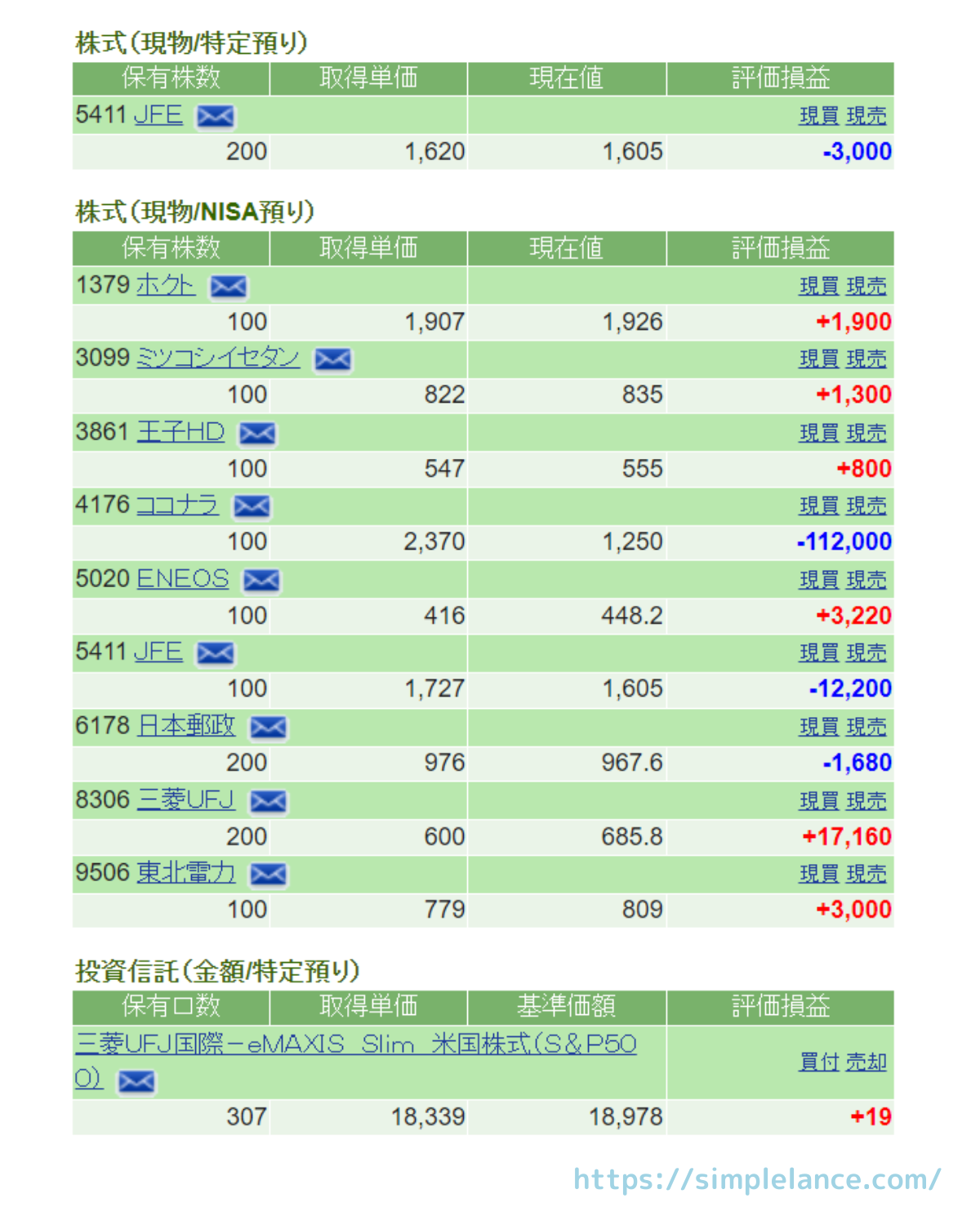 ただ、奇跡的に(?)UFJや長らく含み損だったJFEや日本郵政が上げてきてくれているおかげで、年末より含み損額は減っています。今年はバリュー株がきてくれるのでしょうか?なにはともあれ有難い限りです。