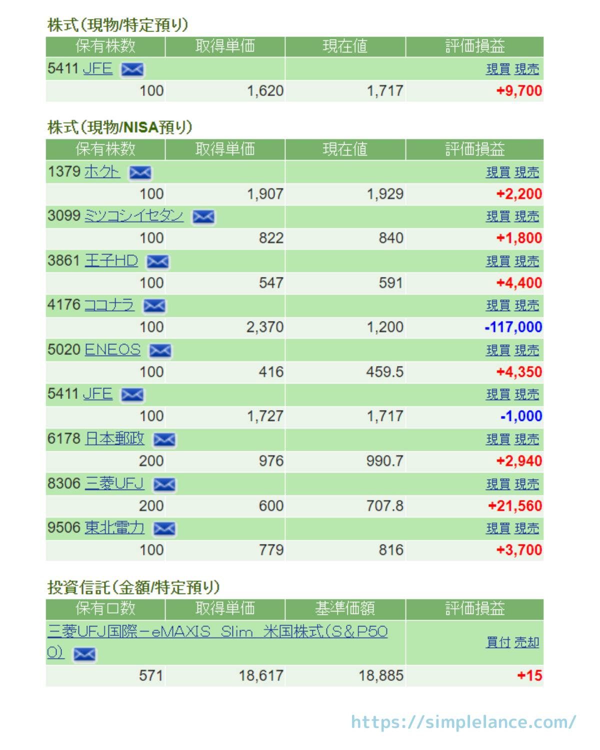今週は日経平均が下げる中でも持ち株の高配当銘柄が上がり、まさかの含み損が減ってくるという嬉しい展開でした。しばらく含み損状態だったJFEがついにプラ転したため、とりあえず100株を売却(+7,700円)しました。