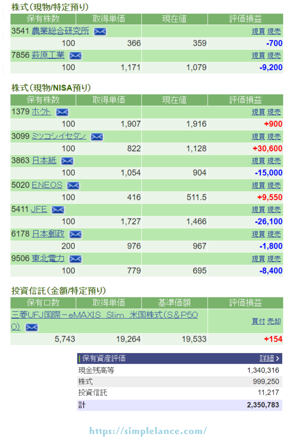 個別銘柄は特に何も取引していないので、変わらずです。株価も基本的にはヨコヨコしている感じです。