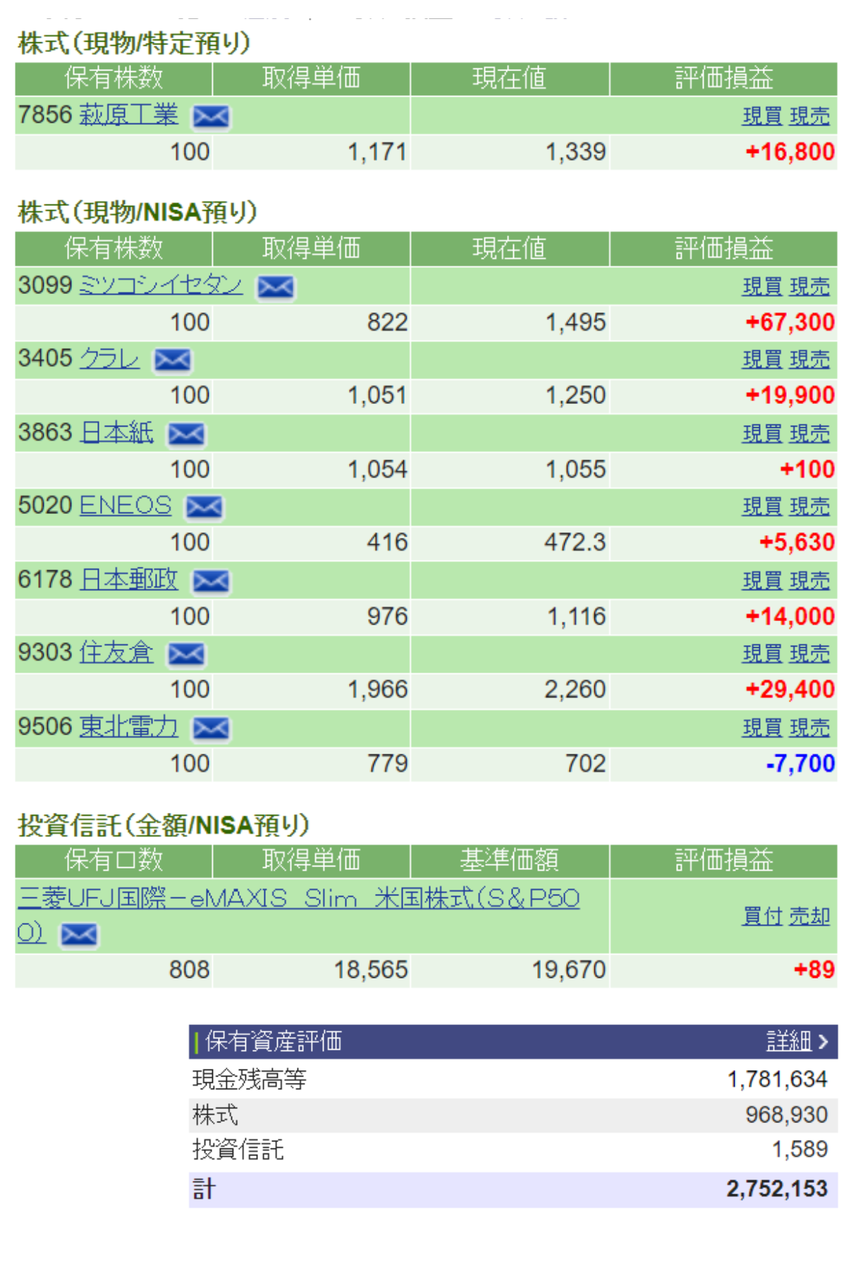 今週末のPFはこんな感じで「東北電力」以外は含み益になりました。