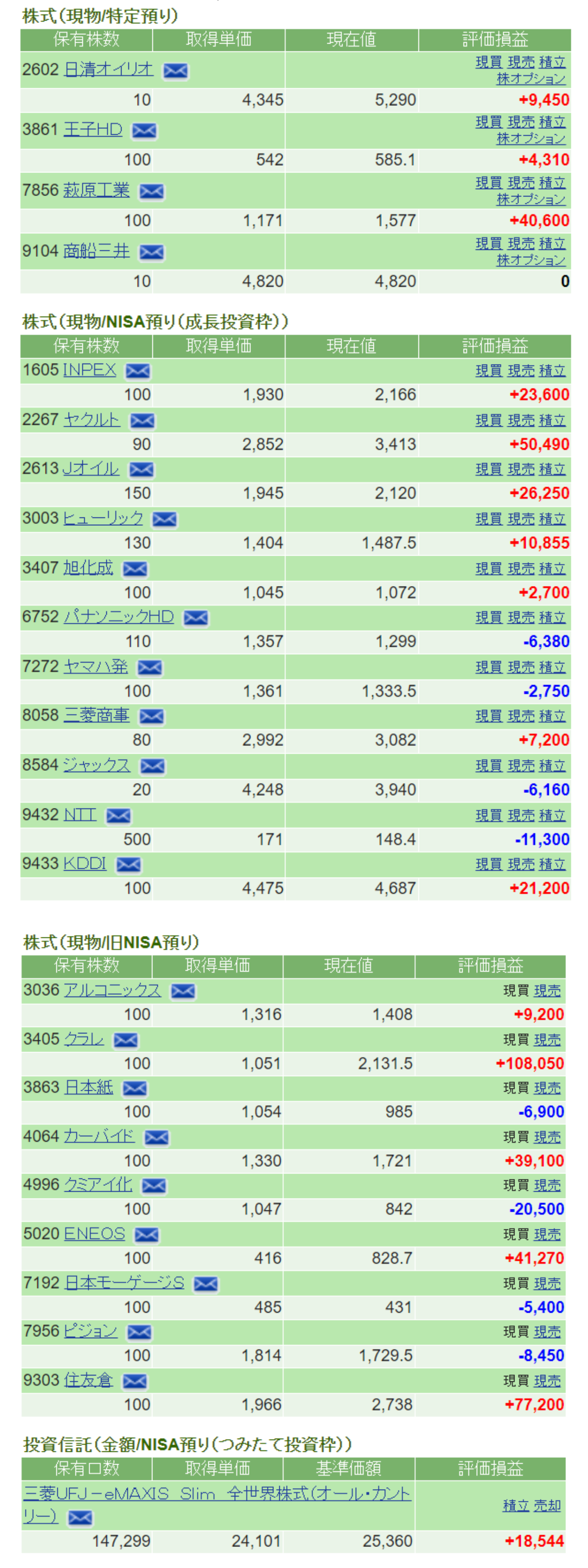 全体的に持ち株が上がってきて含み益が増えて嬉しいです☺