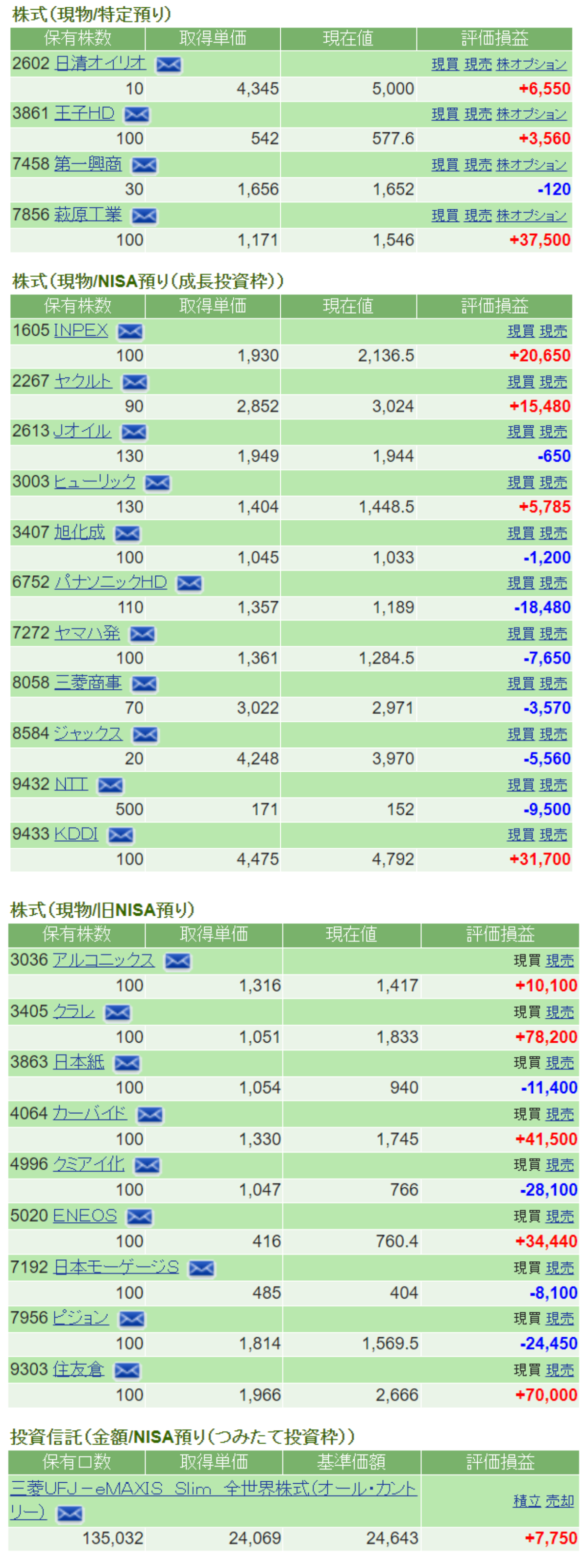 先々週の大暴落からじわじわと回復してきましたね。ドル円は円高傾向になっているので、来週以降はどうなるか分からないですが、含み損銘柄が減ってきて気分は良いです。