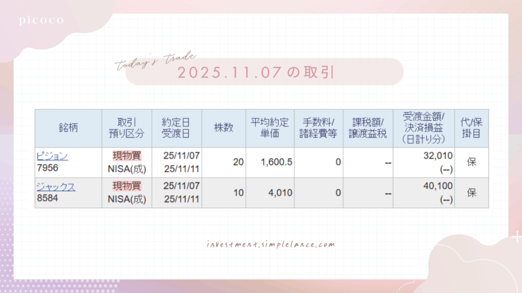 ピジョンは1600円未満、ジャックスは4000円未満で買いたかったので少し残念でした。どちらも下がる度に少しずつ集めて100株まで増やして、頃合いをみてまた売るか、配当を貰い続けていきたいなと思っています。
