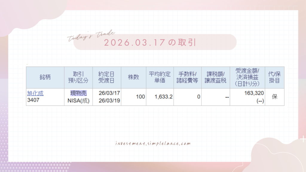となると、あまり選択肢がなく。自分の中で、旭化成は十分上がってくれたし、これ以上の伸びしろをそこまで感じなかったので売ることにしました。