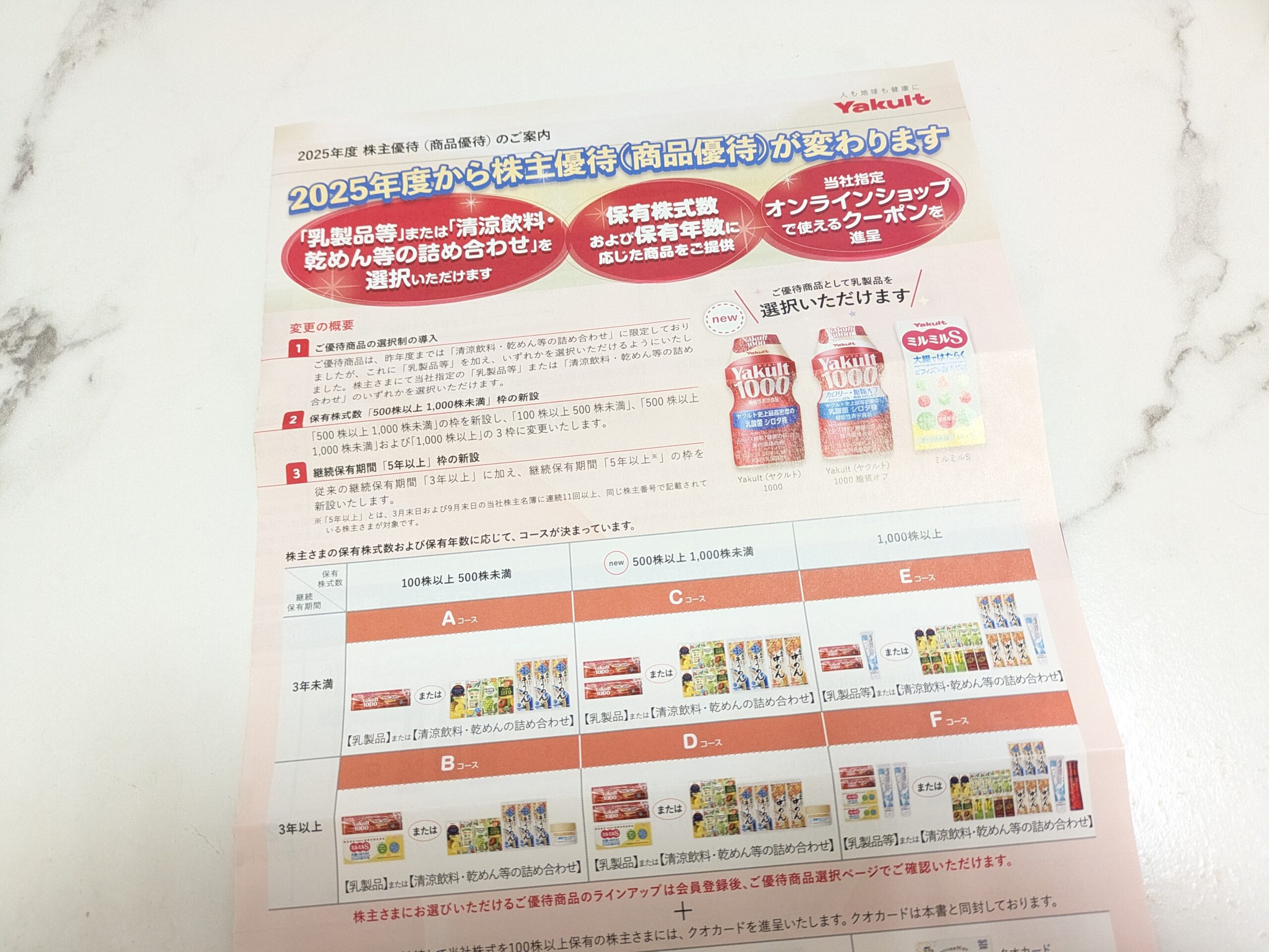 結構前にこんな案内が届いていました。どうやら今年から「乳製品」(ヤクルト1000など)が選べるようになったそうです。